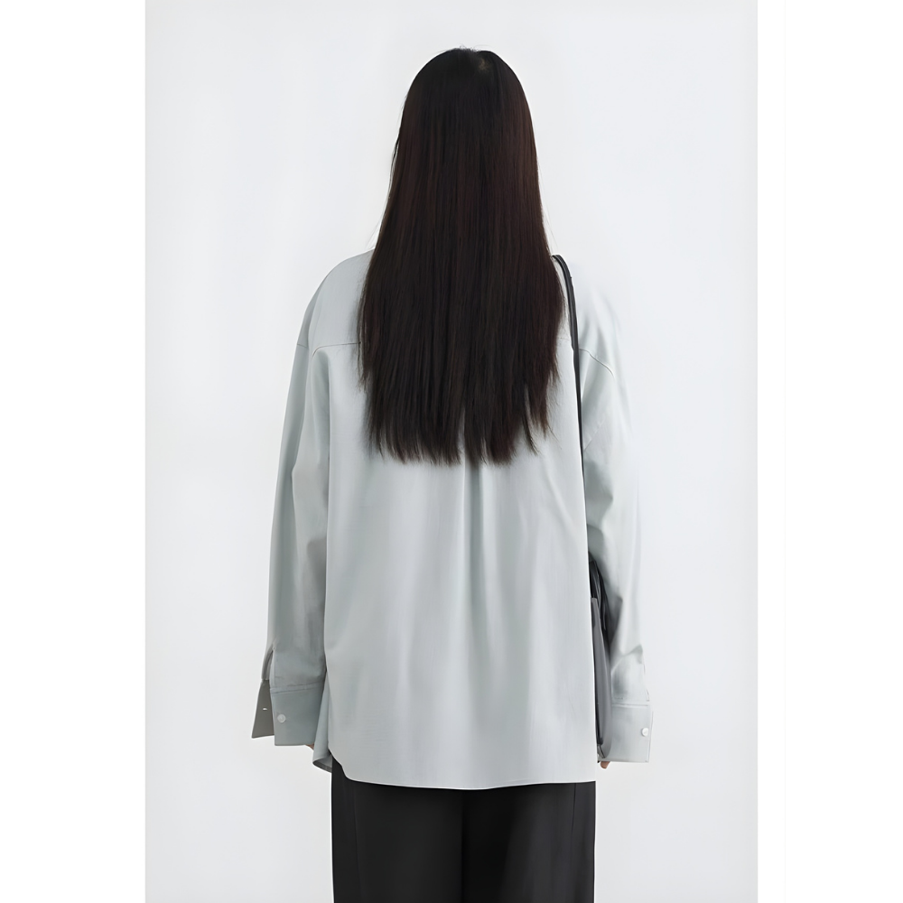 上品さとラフさのちょうど真ん中を突く“都会的ワークシャツ”のような一枚。軽やかな素材がふわりと揺れ、ミニマルなデザインの中にほんのりとユーティリティの香りを残している。胸元には大きめのフラップポケットを左右に配置し、全体の印象を引き締めるアクセントに。ドロップショルダーのシルエットは肩まわりにゆとりを生み、こなれた雰囲気を自然に演出してくれる。前開きのボタンはマットで上品、淡いグレイッシュトーンの生地と溶け合うことで柔らかい表情に。背面に無駄な切り替えを置かず、すっきりと清潔感のあるラインでまとめている点も魅力だ。