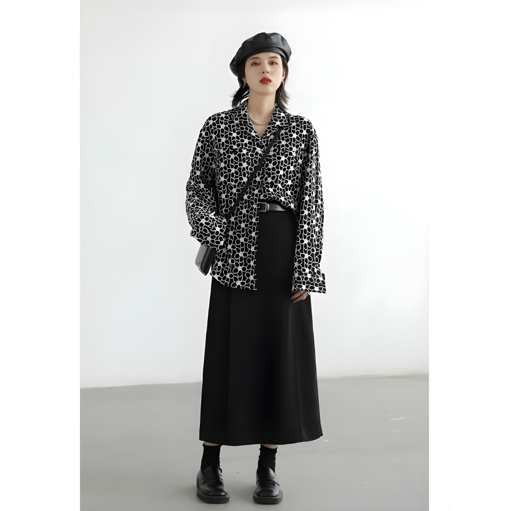 モノトーンコーデが好きなら、画像のように柄シャツ×ベレー帽の組み合わせがおしゃれ度MAX。都会的でちょっとフレンチムード漂うスタイルになります。