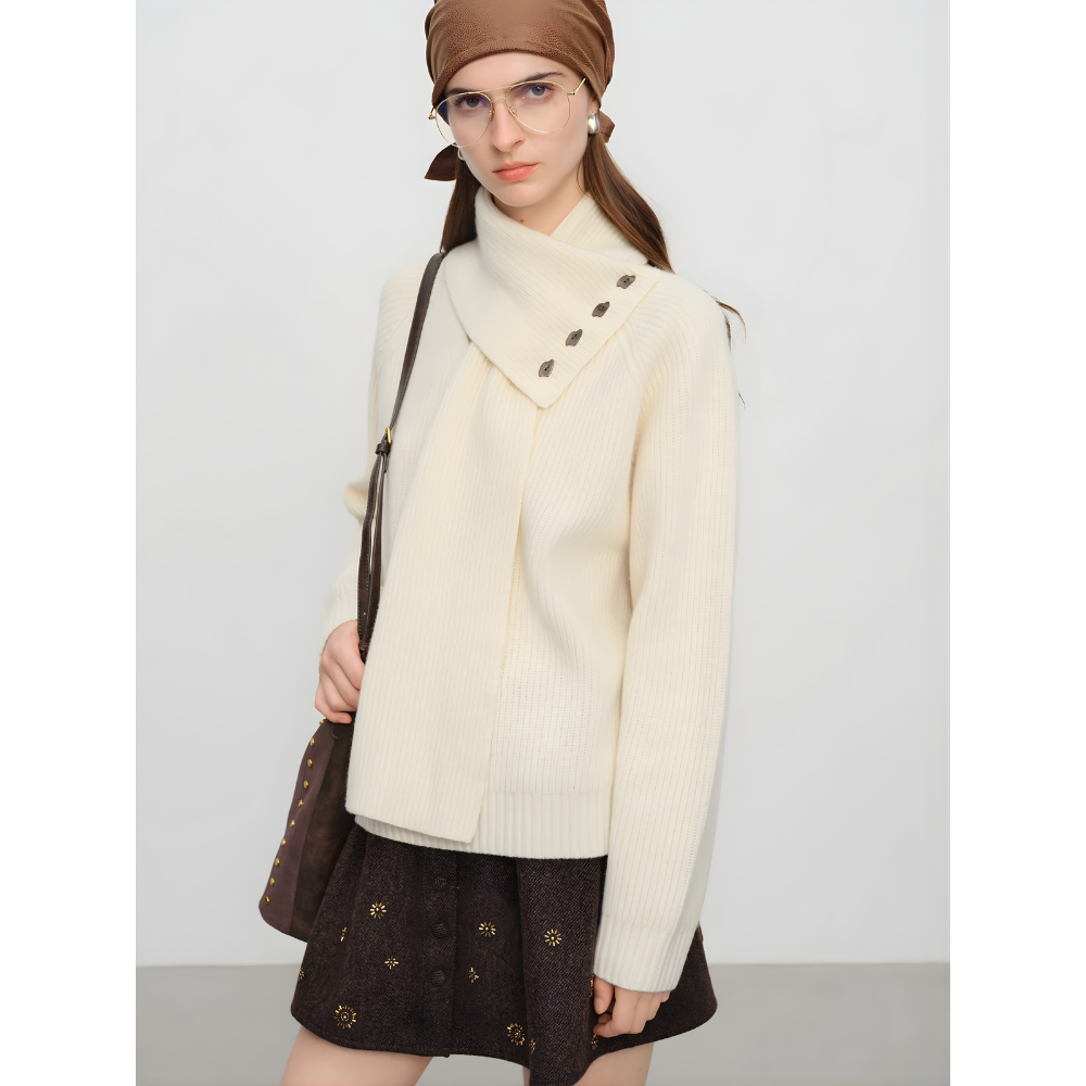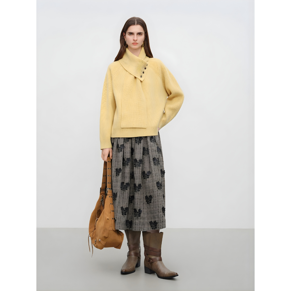 やわらかなクリームイエローが目を惹く、スカーフ一体型のデザインニット。しっかりとした肉感のあるリブ編みニットを使用し、ふんわりと包み込まれるような着心地を叶えています。最大の特徴は、ネック部分にあしらわれたスカーフ風のディテール。ボタンで留めれば立体的なハイネックとなり、防寒性と華やかさを両立。垂らして着ればゆるやかに流れるラインが生まれ、首元にアクセントを添えてくれます。シンプルなシルエットながら、1枚でスタイリングが決まる存在感のあるニットです。袖口と裾はしっかり目のリブ仕様で、全体をすっきりと引き締めるバランスに仕上げています。
